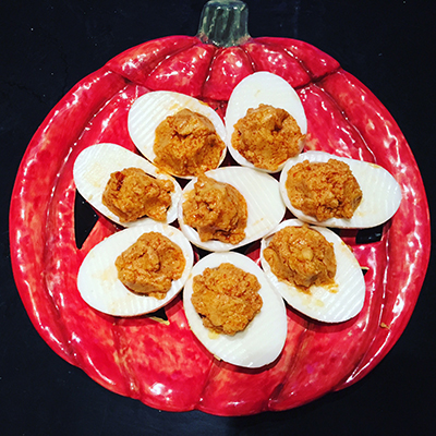 Going out on Halloween especially on a Saturday was just not happening. I deal with enough crazies walking home from work and with sirens already blaring at 5pm, I knew we were definitely staying in. Since we don't get any Trick-or-Treaters where we live, I thought it'd be fun to make some Halloween-themed food. First off, my hubby's favorite, Deviled Eggs! I made them orange with the addition of Mexican Chili Powder and Paprika. They were super cute and super delicious!