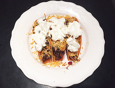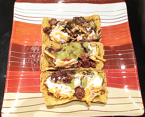 We love doing Taco Tuesdays at home. They're even cheaper than $2 AND the atmosphere is MUCH nicer! I'm always happy to try out new ingredients to make tacos so when I found these Fiesta Flats, I knew I had to test them out! I love the fact that they can stand on their own. One of the things I hate about tacos is that they fall over and all the yummy filling spills out onto the plate. These things were genius! They're a bit small which just means that we can eat more of them! I filled them up with ground beef and onions cooked in LOTS of Taco Seasoning. Then I topped them with Trader Joe's Fiesta Layer Dip, another new find that we're totally in love with!
