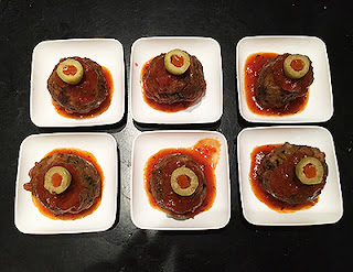 I also made some Meatball Eyeballs with precooked chicken meatballs. To make them look like eyeballs, I added some marinara sauce on top and half of a pimento-stuffed olive. Creepy right?
